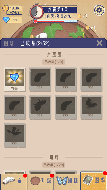 游戏简介: 《小小养蚕师》是一款轻松休闲的模拟养成类游戏,玩家将化身为一名小小的养蚕师,陷入观察和饲养蚕宝宝的愉快旅程。游戏通过简单的点击和放置机制,让你在享受乐趣的同时,体验蚕宝宝从出生到变蝶的美丽蜕变。玩家不仅可以收集不同品种的蚕宝宝,还能通过细心照料,让它们茁壮成长,最终化茧成蝶,迸发出五彩缤纷的蝴蝶世界。重温童年乐趣的同时,体验这份独特的养蚕艺术,为生活增添一份宁静和惬意。 游戏特色: 1、真实养蚕体验 游戏中真实还原了蚕宝宝的生长周期,从蚕卵孵化到蚕宝宝、再到蚕蛹,最后化为翩翩起舞的蝴蝶,每个阶段都注重细节。玩家需要通过控制环境温度和湿度来确保蚕宝宝的健康成长,这种真实感让玩家宛如置身于实际养蚕的场景,乐趣无穷。 2、多样化的蚕种选择 《小小养蚕师》不仅提供了各种不同类型的蚕宝宝,从常见的柞蚕、柳蚕到更为稀有的蚁蚕等,让玩家自由选择、组合,培养出独特的蚕种。这种多样性让每位玩家都能享受到独一无二的养殖体验,同时提升了游戏的可玩性和长久吸引力。 3、精美蝴蝶收集系统 蝴蝶的种类繁多,每一种都有其独特的外观和能力。玩家通过耐心的呵护和适度的点击,可以解锁不同品种的蝴蝶,收集各种各样的美丽形态。解锁过程中不乏惊喜的体验,仿佛在宝藏探险中,期待每一次与蝴蝶的亲密接触。 4、轻松愉悦的游戏氛围 游戏画风清新,界面友好,操作简单,适合各个年龄层的玩家。同时,通过轻松的背景音乐和自然的蝉鸣声,营造出宁静的氛围,让人感受到与大自然的亲密交融。游戏既有趣又让人放松,是忙碌生活中的一款解压利器。 5、社区互动与竞赛 除了单人养蚕体验,游戏还允许玩家间相互交流,分享各自的养蚕经验和成果,甚至进行友善的竞赛。这样的社交机制不仅增加了游戏的趣味性,还能拉近玩家之间的距离,提升游戏整体的互动性和娱乐性。 游戏亮点: 1、沉浸式学习体验 《小小养蚕师》不仅是娱乐,更是一个沉浸式的学习平台。玩家在养蚕的过程中,可以了解到蚕的生活习性和成长过程,培养对大自然的热爱与敬畏,同时提高对生态循环的认知,让学习充满乐趣。 2、时间与耐心的考验 游戏中采用了真实的时间系统,蚕宝宝的生长需要耐心与时间。通过合理管理时间,玩家可以体会到收获的喜悦与成长的过程,强调了持之以恒的重要性,让人更加珍惜来之不易的每一份收获。 3、精致的视觉效果 每当蚕宝宝化茧成蝶的瞬间,绚烂的特效和可爱的动画表现都在屏幕上呈现,让每位玩家为之惊叹。游戏中的每一只蝴蝶都被精心绘制,色彩斑斓、栩栩如生,美不胜收,令人爱不释手。 4、个性化养殖体验 游戏给予玩家极大的自由度,可以根据自己的喜好选择不同的养蚕策略。无论是追求高收益的快速成长,还是享受缓慢收获的乐趣,玩家都可以找到最适合自己的玩法,体验个性化的养殖之道。 5、定期更新与活动 开发团队定期推出新版本和有趣的活动,为游戏注入新的生命力。新蚕种、新蝴蝶和限时活动不断迎接玩家,为其增添了更多挑战与乐趣,让每一次登录都能带来新鲜感与期待。 游戏玩法: 1、蚕宝宝购买与培养 游戏开始时,玩家需要通过初始的金币购买蚕宝宝。点击购买按钮,不断增加你的蚕宝宝数量。随着养成过程的深入,玩家能够体验到不同蚕宝宝的生长特性,设计出属于自己的养殖方案。 2、桑叶采摘与投喂 在养蚕过程中,桑叶是蚕宝宝成长的必需。玩家需要定期采摘新鲜的嫩桑叶,确保蚕宝宝能获得充足的食物。通过合理的投喂比例和时间,控制不同龄期蚕的饲养,让它们健康成长,茁壮成长成为美丽的蝴蝶。 3、观察与互动 游戏赋予玩家观察的乐趣,通过点击蚕宝宝,能看到它们的成长变化以及有趣的行为。伴随简单的互动,玩家可以享受到照顾它们的成就感,同时也能随时管理和调整养殖的策略。 4、化茧与蝴蝶收集 蚕宝宝在特定的条件下会化茧,这也是游戏的重要组成部分。玩家只需轻轻点击蚕茧,便可解锁一只全新的蝴蝶。每当新蝴蝶的诞生,都会带来惊喜,无论是外观还是能力,激动与期待贯穿始终。 5、收益与升级系统 随着游戏的发展,玩家能够根据收获的金币不断升级,提升蚕的收益。通过升级,各种功能和栏位也会逐渐开放,帮助玩家在养蚕道路上更进一步,不断增加收益和收集的乐趣。 游戏优势: 1、低门槛高乐趣 《小小养蚕师》采用简单的点击与放置机制,即使没有游戏经验的玩家也能迅速上手。在轻松愉快的氛围中,玩家可以享受到高自由度的养殖玩法,适合各个年龄段的玩家,让人轻松愉悦。 2、丰富的教育意义 游戏不仅仅是消遣,也是良好的教育工具。通过养蚕的过程,玩家能学习到很多关于生物成长和生态环境的知识,进一步了解自然界的奇妙,让娱乐和教育实现完美结合。 3、社区互动带来的欢乐 跨入《小小养蚕师》的世界,不单独是在进行一场独自的养蚕旅程,更是加入了一个活跃的社区。玩家可以相互交流、分享经验,参与各种活动,形成良好的互动关系,使得游戏更加生动有趣。 4、动态更新与持续体验 游戏开发团队注重与玩家的沟通与反馈,定期推出新内容和活动让玩家保持新鲜感。无论是新蚕品种的推出,还是限时活动的开启,都让玩家在游戏中始终能保持持续的热情与期待。 5、亲近自然的艺术手法 每一位玩家都能从《