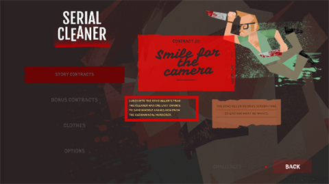 连环清洁工中文手机版是一款潜行清理模拟游戏,玩家将扮演一名清洁工,前往不同的场景进行清理任务。游戏融合了70年代的画面风格,精心设计每个场景的细节,玩家需要利用环境和时间来清理现场留下的烂摊子。 游戏特色: 1、独特的潜行清理模拟玩法,让玩家体验成为一名清洁工的感觉。 2、细腻的70年代画面风格,带领玩家回到过去的复古氛围中。 3、每个场景都经过精心设计,任务内容丰富多样,挑战性十足。 4、隐藏物品和秘密解锁物品丰富多样,玩家可以挑战自己的探索欲望。 5、警察追捕和警觉度系统增加了游戏的紧张刺激感,玩家需要谨慎行动。 游戏亮点: 1、探索感强烈,玩家需要在不同场景中寻找隐藏物品和解锁秘密,增加游戏的趣味性。 2、挑战性十足,随着游戏的进行,难度逐渐增加,需要玩家不断提升操作技巧和战术思维。 3、丰富的场景设计,每个地点都有独特的风格和任务,给玩家带来全新的探险体验。 4、紧张刺激的潜行清理模拟玩法,让玩家感受到不同于传统游戏的刺激和挑战。 5、隐藏物品和秘密解锁物品增加了游戏的可玩性和回放价值,玩家可以不断挑战自己的探索能力。 游戏玩法: 1、通过摇杆控制角色进行移动,在不同场景中躲避警察的追捕并完成清理任务。 2、利用环境对自己有利,找到藏匿点,躲避警察的追捕。 3、寻找隐藏物品和解锁秘密,丰富游戏的内容和挑战性。 4、谨慎行动,利用警察的巡逻盲区将尸体和证物偷走,并抹除一定比例的血迹。 5、挑战自己的操作技巧和战术思维,完成每个场景的清理任务,提升自己的探险能力。 游戏优势: 1、独特的潜行清理模拟玩法,让玩家体验不同寻常的游戏乐趣。 2、精心设计的70年代画面风格和丰富多样的场景设置,打造出复古与现代的碰撞感。 3、隐藏物品和秘密解锁物品增加了游戏的可玩性和探索欲望,让玩家不断挑战自我。 4、警察追捕和警觉度系统增加了游戏的紧张刺激感,让玩家享受紧张刺激的游戏体验。 5、挑战性十足的任务设置和难度逐渐增加的设计,让玩家在不断挑战中提升自己的操作技巧和战术思维能力,获得更加丰富的游戏乐趣。 怎么玩: 1、首先进入到游戏中,点击STORY CONTRACTS,进入到场景内。 2、接着将有一段剧情对话内容。 3、完成后通过摇杆控制角色进行移动。 4、躲避场景中的角色追捕,想办法通关吧。 |