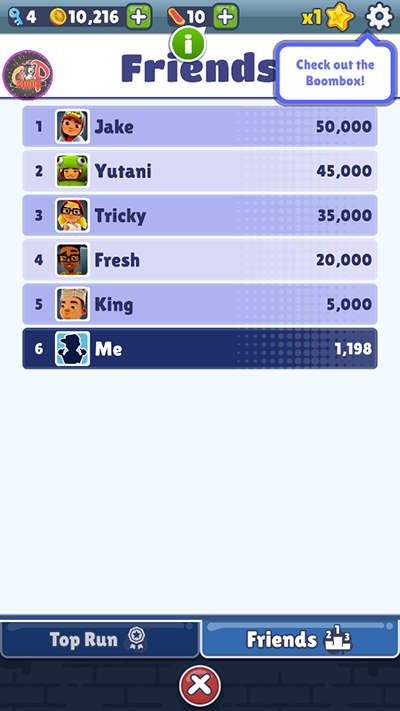 地铁跑酷笑脸金币版本是由热门休闲跑酷游戏《地铁跑酷》修改而来的版本,游戏中的金币变成了带着眼镜的笑脸,大大提升的游戏的趣味性。游戏的操作非常简单,但是不代表游戏的难度低,玩家需要操作主角逃脱警察的追捕,上滑跳跃,下滑翻滚,左右滑改变道路,玩家不仅要躲避各种各样的障碍物,还要小心迎面驶来的火车。地铁跑酷我相信大家都不陌生,可以说是最经典的跑酷类游戏了,也是拥有极高的可玩性的所以才会一直流行到现在。与其它今典跑酷类游戏一样,游戏拥有众多个不同版本。地铁跑酷笑脸金币版本是由一名地铁跑酷忠实玩家自制的版本,此版本将之前的金币替换成了笑脸金币!与其它版本地铁跑酷玩法一样,玩家只需求控制角色在地图中跑酷躲避障碍物以及警察的追捕,也可以解锁更多跑酷角色,同时游戏道具也有所增加也大大的提升了游戏的可玩性。游戏还有多个地区地图可以随意选择,也可以和自己的朋友一起比拼在排行榜上争个高下,快来下载成为一名跑酷高手吧! 游戏特色 1、游戏中金币修改为笑脸金币,提升了游戏的趣味性 2、采用了简洁而精准的点击操作,玩家通过向左或向右滑动手指来转弯。 3、拥有多种不同的场景,例如城市街道、地下河道、雨林等等。 4、每个场景都拥有着独特的关卡设计和挑战难度。 5、玩家需要尽情发挥自己的技巧和智慧,才能成功通过每一关。 游戏优势 1、场景设计:游戏中地铁车站、车厢、地下通道等场景设计非常真实,再加上繁华的都市背景,玩家仿佛身处在时尚的大都市之中。 2、多样化的角色:地铁跑酷提供了许多种不同的角色,每个角色都有独特的外观和特点。 3、完美的音效:游戏中的音效非常逼真,给玩家带来更加真实的游戏体验。 4、可持续发展的在线社区:玩家可以在游戏中与世界各地的其他玩家互动,分享技巧和经验。 游戏亮点 1、采用了简洁而精准的点击操作,玩家通过向左或向右滑动手指来转弯。 2、向上滑动手指跳跃,向下滑动手指滑行,非常容易上手。 3、同时,玩家还可以通过滑动屏幕来进行各种特殊动作。 4、拥有多种不同的场景,例如城市街道、地下河道、雨林等等。 5、每个场景都拥有着独特的关卡设计和挑战难度。 6、玩家需要尽情发挥自己的技巧和智慧,才能成功通过每一关。 地铁跑酷笑脸金币版本怎么加好友? 1、下载安装打开游戏; 2、在游戏主页点击右上角的“排行榜”; 3、在弹出的页面中选择“添加好友”; 4、最后使用“ID查找好友”或“附近的好友”,等待对方通过加好友申请即可。 地铁跑酷笑脸金币版本玩法 1、跑酷基本操作: 虽然跑酷游戏种类繁多,但共同点就是尽量的跑的更远,在保证游戏时间更长的条件下尽可能的获得更多金币,而游戏视角也会跟随角色前进的方向变动。 游戏开始后,可通过手指的左右滑动来改变角色所在轨道,向上滑动是跳跃,向下滑动则是滚动。虽然这些操作都是游戏的基本操作,但在游戏进行时需要通过这些简单的动作进行合理组合,来躲避障碍物和获取更多金币。 对于新手玩家来说,收集更多的金币固然是好,但及时躲避障碍物顺利进行游戏才是最重要的。当游戏角色穿过金币时,金币就会自动收集,游戏道具、道具升级以及新角色都需要金币进行购买。 2、任务系统: 除了惊险刺激的跑酷动作和金币收集外,地铁跑酷还添加了有趣的任务系统,每天只需完成每日挑战就可获得十分丰厚的奖励,游戏中任务类型分为几大类。 任务列表显示在游戏启动界面的主界面上,可以在游戏进行前在屏幕左上方领取任务,也可以在游戏进行时点击暂停按钮进入任务列表,暂停按钮同样出现在屏幕左上方。任务要求包括“收集500枚金币”“赢得1000分”等,当任务完成时主屏幕会出现提示。 每日挑战任务也是地铁跑酷的游戏一大特色,完成每日挑战可以获得特殊奖励,游戏界面点击暂停按钮来查询每日挑战需要完成事项,明确需要做些什么才可获得每日挑战特殊奖励。当任务是收集字母组成单词“ROLL”时,只要完成任务便可获得神秘宝箱。 3、道具和角色: 道具的获取有两种,在游行进行时刻随机捡到一些道具,当然玩家也可以使用金币在商店里购买,同时使用金币还可以对道具进行升级。 常见道具有:火箭推进背包,该道具可以让角色飞起来一段距离并沿路收集金币;超级运动鞋可提升角色正常情况的下的奔跑速度;金币磁铁可将帮助角色收集附近范围内的所有金币;双倍积分可让一定时间内获得的积分*2,以上这些道具都是有持续时间的限制,所以使用时一定要把握好时机,将收益最大化。 4、一次性道具需要手动激活 气垫滑板可使角色在一定时间内成为无敌状态,不会受到任何伤害影响。开启神秘宝箱可随机获得道具、金币或其他物品,建议玩家在资金充裕的情况下开启宝箱。抢跑道具可让玩家在游戏开始前抢先触发,这样便可获得较多积分。当你感觉某项任务难度太大,无法完成时,可以购买道具跳过该任务,建议玩家尽量不要使用该道具,因为任务系统是地铁跑酷十分重要的环节。 游戏中还可以获得解锁角色的道具,也可以通过开启神秘宝箱获得,角色解锁所需道具可在商店中查看。 5、社交功能: 地铁跑酷作为一款出色的跑酷游戏,社交功能当然必不可少,玩家可以邀请好友一起进行游戏,并和他们一较高下,也可以帮助好友赚取更