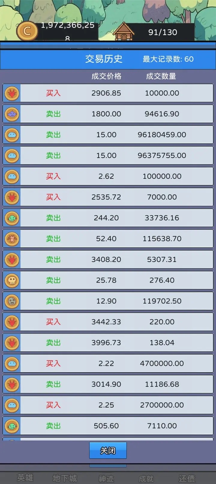 幻想世界币手游最新版2026是一款结合挂机探索与模拟交易的手游,你因为一次意外而欠下皇帝10亿金币的巨额债务,唯一的偿还途径,是踏入一个人类与魔物共存的幻想世界,在这里进行一场精明的“跨物种”金融操作。你需要派遣英雄前往地下城,搜刮史莱姆币、哥布林币等各类“魔物币”,并在实时变动的交易所中低买高卖。幻想世界币游戏中的各类事件会隐秘地影响币价波动,唯有敏锐地甄别信息、判断时机,才能从中获利,最终筹足天价欠款,扭转命运! 游戏特色 1、组建包含骑士、法师等不同职业的英雄小队,派遣他们前往各种地下城挂机探索 2、自动搜刮史莱姆币、哥布林币、兽人币等至少7种专属“魔物币” 3、游戏经济并非一成不变,每日刷新的全局事件系统会直接影响市场 4、不同职业的英雄对特定魔物币的采集有高达210%的效率加成 幻想世界币手游新手攻略 一两天通关,主要玩法低买高出,交易大厅优先升满,史莱姆币涨幅倍数最大。 开始升级设施,后面大部分钱去买币,少部分升级设施。英雄作用小,看喜好有就行。 交易大厅可以修改价格预买预卖。 幻想世界币各货币的基础价格 根据战力和获得货币的比值,算出了各货币的基础价格,即10战力每秒可得1史莱姆币,500战力每秒可得1火龙币。 ●史莱姆:10 ●骷髅:30 ●树妖:100 ●兽人:180 ●鱼人:350 ●僵尸:20 ●哥布林:40 ●狼人:150 ●蘑菇:300 ●火龙:500 更新日志 v1.02版本 英雄列表显示词缀作用。 交易面板显示最近买入卖出的平均价格。 交易面板增加“最大”“最小”按钮。 公告栏更新显示倒数计时。 通关后如果100万的成就没解锁会自动解锁。(老版本遗留bug导致的,打开成就面板会自动解锁。) 其他微小bug修复。 |