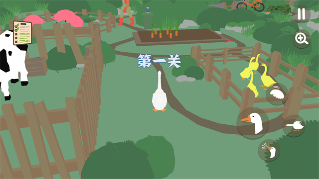 大鹅模拟器2026中文版是趣味十足的大鹅模拟类游戏,扮演成为大鹅,进入到不同的场景中穿梭,叼走各种物品,避开人类的追捕,制造更多有趣的恶作剧吧! 游戏特色 1、各种类型的地图位置不断产生问题,并提供许多可以理解的逃生机会。 2、有趣的故事内容,享受极致的解锁体验。我也喜欢多样化、简化且独特的图形风格。 3、你可以随时体验更多的解谜内容,你的挑战能力可以顺利提升,完成更多的任务内容。 4、玩家可以享受机械模拟体验,在模拟中体验新奇有趣的故事的冒险游戏。 游戏玩法 1.抢小孩子的玩具并用嘴啄他,将行人的收音机给叼走让他追赶你 2.你将穿过不同的城市街道,见识不同的人群,包括单人和小孩 3.捣蛋是你的天性,你要做的就是各种破坏,释放压抑已久的心情 4.作为一只被关押了很久的大鹅,好不容易逃脱了,你开始了你的报复 5.你可以选择捉弄他们一番,他们拿你没有任何的办法 游戏亮点 1、荒诞式的闹剧游戏,在游戏过程中控制一个鹅调戏路人给你带来欢乐。 2、奇葩的动作,各种搞怪的任务,灵活的控制你的鹅穿梭于公园的长椅之中。 3、不断的解锁到更多的地图,收获到一些全新的任务,让欢乐不止。 4、展示出来的效果特别好,追求的都是快乐,能够给人类带来欢乐就是鹅的宗旨。 5、小镇上所有的人都是焦头烂额,面对它的破坏行动毫无办法,静静欣赏就好。 6、为了完成目标也是付出很多精力,养大之间的鹅就只有一个结果,但是大家下不了决心。 大鹅模拟器中文版怎么玩 1、进入后选择关卡 2、每个关卡中都有不同的任务,完成之后就能够解锁下一个关卡。 3、左手的虚拟机可以控制大鹅移动 4、右手的这些按键可以控制大鹅飞起来,偷东西等等,然后和人类斗智斗勇吧! 大鹅模拟器中文版园丁攻略 1、首先,玩家在园丁的花园里能看到一朵花,我们将花从土里拔出来后放在地上。 2、园丁看到花被拔出来后很着急,会将花重新栽到土里,我们可以趁这个时候拿走他的帽子。 3、我们拿到帽子后一路跑,不要被抓到,到河边后游过去,将帽子放到草丛里藏起来。 4、等园丁找不到帽子回去的时候,我们也跟着一起回去,跟着园丁我们可以看到园丁到后面房子的门上拿起了遮阳帽戴,完成让园丁带上遮阳帽。 大鹅模拟器中文版关卡介绍 1、第一关 这一关还比较简单,最好最后完成“野餐”(可以提前把收音机外的物品先运送到) “敲击大拇指”和“换帽子”同时进行; 2、第二关 这一关收集购物商品前,最好先把看门大妈关到仓库,然后把该拿的都运走,节省时间,“让人买回自己的东西”里两个人会有好长一段时间的动画,这个期间可以去垃圾桶那边拿东西; 3、第三关 这关是时间最紧张的,我完成的时候后2s敲钟,要多加练习,偷拿男主人桌子上物品最好在他看报纸的时候,不要引发他的追赶; 女主人那边的东西要拿到另一侧,可以好好利用那个栅栏,虽然是单向的,但是最近的道路,可以把所有该洗的东西直接运过去,不用绕远; 剪玫瑰和花瓶都比较简单,插空隙做,但也有缺点,完成后他们俩必定会互吵一下,有动画耽搁时间; 4、第四关 这关其实很简单,先躲箱子进去(我觉得解鞋带费的时间更长),先和老头完成一个挑战(飞镖或者凳子),然后去表演,再去老头完成另一个挑战; 随后去酒馆收集摆盘物品(最后拿蜡烛),期间把船拿一下,把所有东西都摆好(除了蜡烛),然后把苹果也摆好,最后去酒馆拿蜡烛,顺路把门口守卫引到后门,先把蜡烛放桌子上,然后看着守卫进去,上酒馆推桶,这时候门口也没守卫了,在酒馆直接拿玻璃杯走,在桥边把杯子直接扔到运河里。 大鹅模拟器中文版隐藏任务介绍 1、把园丁锁在花园外 第一章将钥匙偷走藏至草丛中,然后引园丁出门,顺势关死木门; 2、洋白菜野餐 第一章将南瓜旁边的白菜推到餐布上(白菜旁边有个隐藏的洞口),不能叼走,只能慢慢推过去; 3、把小男孩绊倒在水坑里 第二章,先把小男孩鞋带解开,然后冲水坑的方向吼叫,让他往那跑,每跑几步就会绊倒,触发在水坑摔倒即可; 4、让商店的称叮起来 第二章,先把大妈困在车库里,然后往她小商铺的称上加东西,直至加到红色区域触发; 5、在电视商店打开雨伞 第二章,在小商铺里偷一把雨伞,先让小男孩打电话把电视商店里的店员引开,拉雨伞进去然后在店里把雨伞打开(最好拉雨伞头,雨伞把是打开雨伞的)让大街以外的人买回自己的东西 第一章和第二章,把第一章园丁的锄土的铲子叼到第二章的小商铺里,然后引诱园丁去小商铺,触发; 6、收集五支花 每一章有一只花,收集地点是第二章之后往下一关走再往里走,一口井旁边有个篮子,把所有的花收集至此; 第一章,很明显就是园丁种植的花;第二章,在小商铺里有一朵花(位置大概在商铺中上部);第三章,触发修剪玫瑰,这就是第三朵花;第四章,“得到鲜花奖励”挑战,这个就是第四朵;第五章,很明显,进去就能看见种在地上; 7、把小男孩困在车库 第二章,用小男孩的飞机将他引至车库困住; 8、抓住抛过栅栏的物品 这个有些难度,就是提前把第三章女主人的物品拿到男主人那边,然后他从这边扔回来,大鹅要提前预判位置,在空中抓取上; 9、被抛过栅栏 将第四章门口的隐藏盒子拖拉至第三章的男主人区域,然后自己隐藏在箱里里,用叫声吸引男主人过来,他会把你当作女主人物品也扔过去; 10、用后院外的物品打扮半身像 这个需