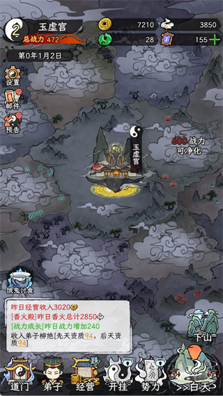 了不起的道门是一款融合修仙与经营策略元素的手游,玩家将从一个荒废的道观起步,亲手重建宗门,招募各类奇葩弟子,提升宗门战力。游戏中,玩家不仅需要通过香火殿积累资源、培养核心弟子,还能经营黑市、研发法器、带领弟子除魔抓鬼、摸金发财,逐步发展壮大宗门。多样化的玩法、丰富的资源管理和独特的摸骨术系统让每一次决策都充满策略性,带给玩家一场充满挑战与趣味的修仙之旅。 游戏特色 1、【重建道门】 从扫地除尘开始,亲手将荒山破观建为云间仙门。 2、【奇葩弟子】 随缘招徒,你可能捡到先天道体的天才,也可能招来只会干饭的“关系户”。 3、【资质检测】 用“摸骨术”摸摸弟子根骨,小心别摸到不该摸的地方! 4、【黑市之王】 暗中经营地下坊市,倒卖法器、贩卖“秘籍”,甚至偷偷给对头宗门卖假货。 5、【香火玄学】 在香火殿求签问卦——今日上上签,香火钱翻倍;今日大凶…快关山门避灾! 6、【炼器鬼才】 研发道器,从“驱邪桃木剑”到“渡劫避雷针”,只有想不到,没有炼不出。 7、【下山搞事】 带队除魔抓鬼,是替天行道?还是只为摸金做点“小生意”?你说了算! 了不起的道门手游新手玩法介绍 一、起步阶段:创建宗门 1、建香火殿 游戏刚开始,系统会明确提醒香火殿是获取香火的核心建筑。优先完成香火殿的建设,它是每日香客进香的主要来源,能够为你提供前期的香火和铜钱,这两者直接影响宗门的升级和弟子的培养。 2、收极品弟子 在求道台遇到先天+后天资质双100的弟子时,千万不要错过,这种资质出色的弟子,是宗门战力的核心。后续通过道行和战力的提升,他们会远超普通弟子。因此,优先将资源分配给这些顶级弟子,培养他们是宗门发展的关键。 3、分配道舍 道舍是弟子休息与成长的关键设施,点击为新弟子分配道舍,可以大幅提升他们的每日道行。道舍的早期投入对弟子的成长至关重要,尽量不要犹豫,第一时间为他们分配。 二、发展阶段:宗门升级与全面经营 1、升级道门 当总战力达到升级要求时,立即升级道门,升级后不仅会解锁更多弟子,还能开放炼器、织造等功能。同时,道门的升级能够提升每日进香人数和收入,是宗门扩张的关键。 2、经营市场 市场会每日自动刷新商品。优先购买【跌价】的商品,并通过低价买入、高价卖出的方式快速积累铜钱。你还可以开启佛系经营功能,这样就能稳定地获取每日铜钱,为弟子培养和宗门建设积累资金。 3、弟子开挂 对于核心弟子,首要消耗500铜钱开启第一次【开挂】,以提升他们每日的道行成长,快速提升战力。后续可以消耗灵玉解锁更多弟子同时【开挂】的功能,从而加速更多弟子的成长。 三、长期规划:资源分配与稳步扩张 1、资源分配 在游戏初期,铜钱和香火的资源相对有限。优先将资源分配给资质优秀的弟子。通过【开挂】、道舍、斋堂等功能的资源倾斜,迅速提升宗门核心战力,从而带动整个宗门的发展。 2、持续招募与筛选弟子 每天都要去求道台招募新弟子,优先选择资质达到90以上的弟子。通过筛选,淘汰资质平庸的弟子,确保宗门的弟子质量,避免资源浪费。 3、除魔与摸金 当解锁下山功能后,可以带领弟子外出除魔抓鬼,不仅能提升宗门的声望,还有机会获得稀有资源。通过除魔和摸金,为宗门建设和弟子培养积累重要物资,灵活选择适合的资源获取路线。 4、逐步解锁功能 随着等级的提升,你会逐步解锁更多功能。例如,解锁道舍(2级)、开挂(3级)、成就(4级)、斋堂(5级)等。每个新功能的解锁都会极大提升弟子的成长和宗门战力,帮助你更好地规划和发展宗门。 游戏亮点 1. 独特的修仙题材结合模拟经营玩法,让玩家在体验修仙乐趣的同时,还能感受经营道门的挑战。 2. 游戏中弟子资质和性格各异,玩家可以通过“摸骨术”检测弟子根骨,招募到先天道体的天才,也可能遇到只会干饭的“关系户”,增加了游戏的趣味性和不确定性。 3. 丰富的经营方式,如暗中经营地下坊市、倒卖法器、贩卖“秘籍”,甚至给对头宗门卖假货,为玩家提供了多种发展道门的途径。 4. 玩家可以带队下山除魔抓鬼,是替天行道还是摸金做“小生意”,由玩家自己决定,增加了游戏的自由度。 5. 游戏画面风格独特,结合了国风与现代元素,为玩家营造了一个充满仙侠气息的游戏世界。 更新日志 v1.0.0版本 《了不起的道门》上线 |