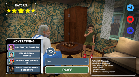 逃离家暴2中文版2026是逃离家暴系列新游戏,玩家将要进入到祖父母的家中,为了逃脱父母的命令,进入到不同的场景中进行躲藏,解开一系列的谜团,想办法逃离出去。 游戏特色 1、以家暴问题为主题,剧情基于真实案例改编,展现了家庭暴力的残酷现实,通过游戏让玩家了解家暴的危害和影响,提高公众对家暴问题的认识和关注度。 2、游戏共有八种结局和隐藏彩蛋,玩家的不同选择和行动会导致不同的结局,增加了游戏的可重复性和探索性,使玩家有更多的动力去尝试不同的玩法。 3、游戏采用3D引擎制作精细场景,如昏暗的走廊、咬吱作响的地板和突然的、令人不安的噪音等,最大程度地放大了恐惧,营造出紧张刺激的氛围,让玩家感受到每一步都充满危险。 4、设计了多个不同的场景,每个场景都有其独特的氛围和挑战,如房间、客厅、厨房、储藏间、阁楼等,玩家需要在不同的场景中寻找线索、解开谜题、躲避父母,增加了游戏的多样性和新鲜感。 逃离家暴2怎么玩 1、打开游戏,我们发现纯英文界面,我们不用担心很基础的,我们直接点击start game按钮开始游戏。 2、在这里还拥有不同的游戏难度,小编选择easy也就是简单难度。 3、成功进入到游戏中去,我们会出现在一辆车上,在这里的对话中,我们可以知晓父母为了享受双人假期时光,把我们丢给了乡下的祖父母。 4、游戏玩法非常简单, 就是在这个老登不注意的情况下,完成逃离。 逃离家暴2彩蛋攻略 1、前往房间,输入电脑密码(Andrew2002)打开电脑→右下角有个主角游戏:恐怖逃脱。 2、主角本人会变成隐身。通过移动视角来观察以往看不见的视角,比如父母在干什么,能观察到父母在不同情况的不同状态、把爸爸的电视关掉,吃东西,父母会变成疑惑的状态,可以看到家门口那对情侣的真实面容等 3、可以移动父母、改变父母的形状 逃离家暴2游戏介绍 1、潜行经过敌人并利用环境不被发现。 2、老人和其他角色会对噪音和可疑行为做出反应,所以尽量保持安静并远离他们的视线。 3、找到隐藏的物体并用它们解决问题以进一步前进。 4、收集资源,制作有用的物品并使用它们来逃脱。 5、带有恐怖元素的动作冒险,沉浸在恐惧和紧张的氛围中。 6、通过主角的眼睛体验整个世界,充分体验这场激动人心的冒险。 游戏亮点 1、第一人称视角与动态环境:采用3D第一人称视角,高度还原家庭场景细节,如凌乱房间、吱呀地板,搭配父母复杂AI行为模式(会注意房门开合、脚步声、突然巡逻),增强代入感与紧张感。 2、多结局与隐藏彩蛋:提供8种结局及隐藏彩蛋,玩家不同选择触发差异化剧情(如屋顶逃脱、安眠药迷晕父亲等),提升重玩价值。 3、现实议题融入:基于真实家暴案例改编,通过游戏机制揭露“以爱为名”的控制对儿童的伤害,引发玩家对家庭教育的深度思考。 4、情感共鸣与治愈:玩家在解谜过程中体验主角心理变化(从压抑到反抗),适合有类似童年经历者产生情感共鸣,同时呼吁社会关注青少年心理健康。 游戏优势 - 独特的潜行和捉迷藏机制:潜行经过敌人并利用环境不被发现。 - 聪明的敌人:老人和其他角色会对噪音和可疑行为做出反应,所以尽量保持安静并远离他们的视线。 - 有趣的谜题和隐藏地点:找到隐藏的物体并用它们解决问题以进一步前进。 - 库存和制作系统:收集资源,制作有用的物品并使用它们来逃脱。 - 带有恐怖元素的动作冒险:沉浸在恐惧和紧张的氛围中。 - 3D第一人称游戏:通过主角的眼睛体验整个世界,充分体验这场激动人心的冒险。 |