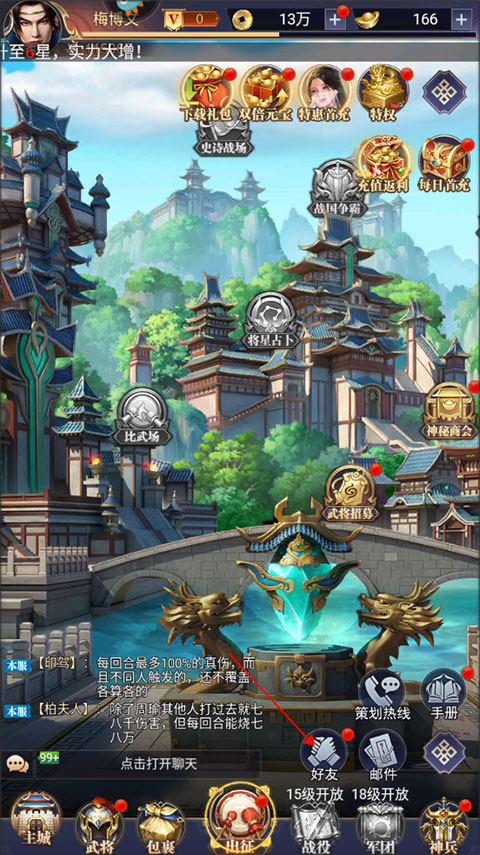 止戈之战2026小米版是一款以三国故事为背景的卡牌策略类游戏,游戏中玩家将穿越到东汉末年,以一方诸侯的身份开启你的三国旅程。其最主要的玩法是以三国剧情为主线的闯关玩法,以历史上不同的事件和典故为主线,将整个三国历史分为若干个章节,然后一个章节再由多个小的关卡串联起来!在不同的关卡中你将面临不同的敌人,玩家必须根据自己手中的武将进行阵容搭配,以克制关系和武将羁绊为基础来战胜敌人。前期的玩法是以主线征战为主,后期的玩法则更多是集中在玩家之间的PVP对抗和军团玩法上,还有宏大的战役系统和神兵系统也能为你的三国征程增色不少。如果你对三国策略游戏感兴趣,止戈之战绝对值得一试! 游戏特色 1、【千机谋尽定乾坤 青梅煮酒尚可温】 千古名将,一览风流。你可以选择扮演曹操、刘备、孙权等统率三军,雄霸一方以夺天下,也可以选择创建自定义人物建立自己的三国。 2、【温香软玉抱满怀 汝妻甚美下回还】 铜雀高台,春色旖旎。铜雀台里养着三位美人,主公可以选择不同美人上阵,即可获得对应的美人属性加成,美人在侧,雄风大振! 3、【挂机偷得半日闲 主公卧榻尽情眠】 与其他逼肝逼氪的三国战略游戏不同,在三国放置策略手游《止戈之战》里,主公可在游戏主线出征进行放置式挂机,并且能够随意切换战斗页面。 4、【春风得意不知愁 只因身价比诸侯】 我有一将,可抵万军。超高概率无限抽卡,十连必出金色武将!一键零成本自由换将,战场风云未雨绸缪,主公英明自在人心! 止戈之战小米版新手攻略 1、下载安装好游戏,选择区服进入游戏。 2、进入之后进行创建角色。 3、点击武将招募可以获取一名武将。 4、点击游戏主页面下方的出征按键之后再点击挑战开始战斗。 5、你可以派遣刚获取到的武将上阵。 6、当怒气满时,角色会释放强大的技能。 7、将场上的所有敌人消灭即可获取丰厚的游戏奖励。 止戈之战小米版如何添加好友 1、首先在游戏的主页面中找到好友按键,如图所示。 2、进入之后,点击添加好友。 3、输入你要添加好友的游戏名字,点击查找搜索,在点击右边的加为好友。 4、对方会收到游戏好友添加申请,点击打勾即可同意。 游戏亮点 【主公!来一碗“曹操盖饭”吗?】 放肆!吕布竟敢偷袭我兖州,一介匹夫不讲武德; 无妨!待我率领大军破徐州,教他一招兵不厌诈! 【选江山还是美人?我全都要!】 东汉十三州寸寸归我,曹公刘备?走走走; 铜雀大小乔夜夜侍奉,周郎孙策?去去去! 【看招!我的大刀早已饥渴难耐】 手握青龙偃月刀,学得关二爷五关斩六将; 倒提龙胆亮银枪,化身赵子龙千里走单骑。 【不卖草鞋不吃苦 接着奏乐接着舞!】 四职业,九宫格,放置战斗谈点策略; 三分鼎,四海平,入主中原听点小曲~ 游戏优势 1、玩法多样,带你体验真正的三国策略 2、建设城池、排兵布阵、群雄纷争,享受即时战略 3、合理运用兵种,武将,技能搭配来取得属于自己的天下 4、操作自由,轻松上手,随时打开手机就能玩,可肝可佛满足不同玩家 更新日志 v1.10.6.2版本 限时活动开启 |