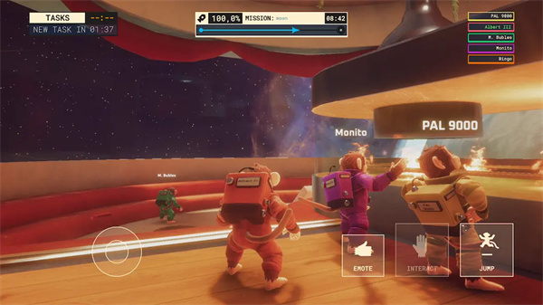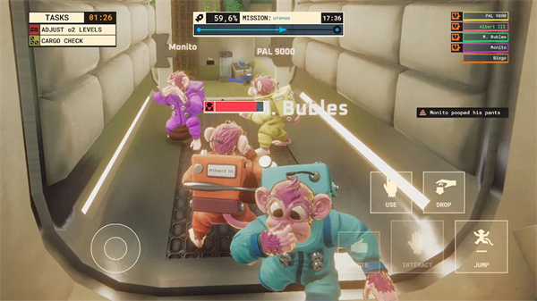 猩空大冒险游戏手机版2026是欢乐有趣的多人动作游戏,玩家将要化身成为太空猴子,加入到执行太空飞船的冒险之中,处理各种突发状况、升级飞船舱室,协力共进,否则一起翻船! 游戏特色 1、携手共进 在太空里,唯有同伴能听见你的惨叫!通过合作迷你游戏互相协助,确保飞船航线无误。伸出援手救醒昏迷队友。切记:仅在医疗必要时使用反射锤击晕同伴。绝对不要把朋友排泄到黑暗孤寂的宇宙空间——除非他们罪有应得。 2、各就各位 猴子生意开张啦!完成分配的刺激小游戏履行职责:调整推进器、启动防护罩、烹制美味餐点、如厕(或不)、还有更多任务!但别磨蹭太久,否则飞船将陷入火海、舱体破裂、太空病毒肆虐的灾难! 3、解锁飞船潜能 飞船是你远离家园的临时居所。每当成功完成任务,你将根据表现获得研究点数。用这些来之不易的点数解锁飞船新舱室——每个舱室都配有全新迷你游戏,并可通过升级设施提升实用性。 4、星际远航 祝您旅途愉快!前往太阳系六大目的地展开探索。但请警惕!当您远离亲爱的地球母亲时,将面临更多维持飞船航行能力的任务,太空突发事件也将日益频繁。 猩空大冒险怎么玩 1、进入到游戏中,点击即可体验完整的游戏内容 2、玩家可以根据自己的喜好进行设置。 3、扮演猴子进入太空。 4、开启新的冒险吧。 猩空大冒险玩法介绍 1、下载并安装好猩空大冒险后打开游戏,开房间后可以和好友一同出发完成任务。 2、解救任务中玩家需要结合周围线索进行场景破坏,在血量耗尽钱救下即可完成任务。 3、还有起火这类突发状况,玩家需要使用周围的水源进行灭火否则飞船会受损。 4、还有限时逃脱类任务,玩家需要和伙伴一起在舱门关闭前成功逃脱才会完成任务。 游戏亮点 1、游戏采用卡通萌系画风,太空场景细腻逼真,猩猩角色造型可爱讨喜。 2、支持1至8人联机协作,可远程联机或本地同屏,单人也能顺畅畅玩。 3、内置40余种趣味迷你游戏,涵盖飞船操控、故障维修等多种任务类型。 4、解锁8个特色飞船舱室,每个舱室可升级,升级后提升任务成功率。 5、设置6种难度模式,从入门到高阶逐步提升,满足不同玩家挑战需求。 游戏优势 1、充满未知的全新星系等待玩家来探索,体验更加丰富的内容。 2、较为可爱的卡通3d游戏画风,十分可爱的猴子深受玩家们的喜欢。 3、玩法非常的自由,按照你的想法来进行游玩。 |