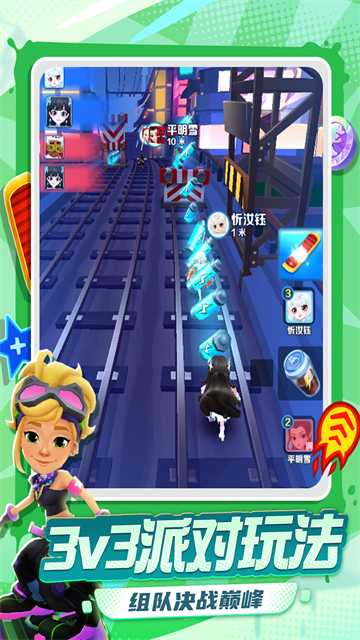 地铁跑酷应用宝版是一款经典又好玩的跑酷游戏,拥有简单的上手操作、丰富的游戏画面、众多的城市场景。游戏背景设定在地铁铁轨上,玩家要帮助杰克和淘气的小伙伴们逃离警察的追捕,闪避前方障碍物与往来的地铁。除了经典的地铁轨道追捕玩法之外,游戏屡次创新玩法,比如大家一直期待的联机玩法也开发出来了,玩家可以和好友一同在地铁轨道上跑酷,和好友比赛看谁跑的更远、手速更快。地铁跑酷游戏采用采用了3D立体视角,画面更是大胆的采用了绚丽的色彩,画面不仅没有让玩家产生反感,反而在跑酷游戏中画面都是高质量的,给玩家一种视觉上的强烈享受。 游戏特色 1、竭尽全力冲刺! 2、躲避迎面而来的火车! 3、帮助高级、技巧娴熟以及毫无经验的新玩家逃避性情乖戾的检查员及其斗牛犬的检查。 4、与冷静稳健的队友一起打造火车! 5、装饰火车并绘制生动有趣的高清图像! 6、悬浮滑板冲浪! 7、装饰已启动的jetpack! 8、闪电般快速猛击特技! 9、挑战并帮助您的队友! 地铁跑酷基础角色介绍 可操控角色游戏中有上百个可操控角色,会根据游戏场景地图特色来设计。开局的默认角色为杰克,玩家可以通过活动、商店等获取其他角色。下面给大家介绍一些基础角色: 1、杰克 在单亲家庭长大,沉浸在对街头艺术的热爱中,常常天马行空思考人生,梦想着做一件很酷的事情。 2、琪琪 费尔柴尔德家族的唯一继承人,热爱街头文化,虽已被皇家芭蕾舞学院录取学习,却心藏成为街舞艺人的愿望。 3、青青 富有想象力的技术派达人,痴迷科学研究,喜欢发明创造,她总认为自己可能不属于这个地球。 4、小黑 非裔美籍男孩,也是音乐发烧友,无论走到哪里,都有音响为伴。 5、弗兰克 兔子面具遮住了容貌,黑色西装公文包的上班族装扮掩饰了技术黑客的身份。 6、钉子 朋克摇滚是他的着装风格,发型根据服装而变化,乍看便知是热爱音乐和街头文化的摇滚少年。 地铁跑酷道具介绍 在无尽模式(包含经典无尽模式、分数赛)上,可拾取金币、收集物、钥匙、滑板、宝箱等道具,另外也可以通过完成任务、参与竞技场等方式来获得。 1、金币: 每轮跑酷结束后,用赛道的收集数+积分计算而得,可用于解锁角色、滑板,升级宝物、角色、道具等。 2、钥匙: 用于解锁角色、滑板等,也可用于兑换宝物钥匙等。 3、磁铁: 可吸附赛道上的硬币持续十秒(后续可升级,时间加长)。 4、滑板: 碰撞后可产生1次伤害抵消,部分滑板单独拥有附加属性,或者和角色组合会有额外属性。 5、弹跳杆: 可弹跳到空中,拾取磁铁,喷射背包,超级跑鞋任一道具。 6、得分倍增: 在起跑阶段使用,可获得额外倍数增加。 7、超级起跑: 在起跑阶段使用,可直接向前飞行1万米(后续可升级)。 8、喷射背包: 可助飞到半空中,持续10秒时间(后续可升级,时间加长)。 9、超级跑鞋: 可提升跑酷高度,跳上或越过列车车顶。 10、二级跳: 可解锁二次起跳技能,跳上列车车顶。 11、双倍得分: 可使分数在一定时间内乘以2倍结算。 12、宝箱: 开启宝箱可获得一定数量的金币、钥匙等道具。 13、收集物: 每一个版本和新赛季秘典有对应的收集物,可通过赛道或者完成任务、参与竞技场获得。 地铁跑酷特色系统 1、交易系统 在游戏里,玩家之间是不能进行彼此的交易操作,但玩家可以从游戏商店中购买到游戏道具、角色等。 2、社团系统 在游戏里,玩家等级达到2级,可以开启社团系统,创建或加入社团进行聊天互动、约战开黑或完成社团任务。 3、任务系统 任务分为等级任务、每日挑战任务、每周活动任务、成就任务、秘典任务和社团任务。等级任务即提升玩家等级任务,每日挑战任务即收集英文字母拼单词任务,每周活动任务即每周一种收集物任务,成就任务即累积触发达成的任务,秘典任务即在秘典中触发的任务,社团任务即在社团触发的任务。 4、竞赛系统 游戏内开设竞技场,有分数赛、道具赛、好友开黑三种模式可供玩家选择。 5、衍生作品 除了手游,还推出了《地铁跑酷》动画系列,围绕杰克、琪琪、青青、小黑、警卫与狗,展开讲述跑酷者团队的故事,总共11集,另有番外篇,主要解读跑酷者们的资料信息。 地铁跑酷怎么提高分数 1、首先可以完成任务来增加倍数。(最高*30) 2、其次可以升级技能获取更多金币,金币可以加成分数。 3、同时可以使用道具来增加倍数或进行开具冲刺。 4、还可以使用滑板来使自己多一条生命值。 5、最关键的是在玩的时候要专注冷静,避免不必要的死亡。 地铁跑酷怎么两个人玩 1、在地铁跑酷游戏中,点击游戏界面下方的【竞技场】进入到此游戏功能; 2、随后在竞技场的功能界面中,就可以看到最下方的【好友开黑】接着点击其中的【开始比赛】; 3、然后玩家可以在弹窗中点击【创建开黑房间】创建一个游戏房间; 4、在创建房间成功之后,就可以看到房间下方会有一个【房间号】发送给另一个玩家; 5、另一个玩家按照上方的步骤,在创建开黑房间的那一步中,在其弹窗的下方【输入好友分享的房间号】点击【加入】就可以进入到好友创建的房间,一起进行双人游玩。 游戏优势 1、游戏画面高清细腻,各种不同的跑酷玩法自由选择,全新的冒险就此开始。 2、精彩的竞争挑战,酷炫无比的操作模式,搭配全新的挑战玩法,带给你想象不到的乐趣。 3、它会随着每一个活动的增加而增加