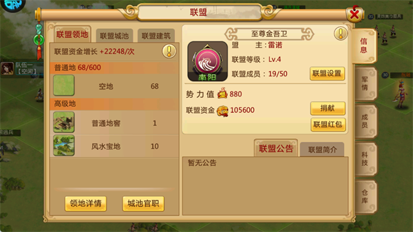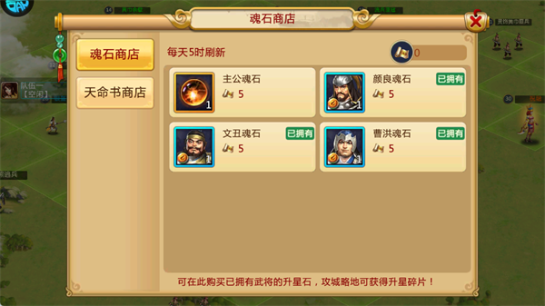 胡莱三国2TV版是一款集策略、战争与养成于一体的大型国战手游,此版本专为电视端用户推出,继承了前作经典的攻城掠地和击杀贼寇玩法。游戏不仅延续了三国时代的热血对抗,还加入了全新的玩法和内容,带来更加丰富的游戏体验。玩家可以通过攻占城市、击败贼寇、征讨敌人等多种方式,获得战功与资源,提升武将和官职,挑战自己在三国时代的策略智慧,玩家将体验到前所未有的战略布局与联盟合作,共同书写属于自己的三国传奇! 游戏特色 1、经典国战玩法 延续攻城掠地和击杀贼寇的经典玩法,玩家在三国乱世中争夺领土、攻城略地,体验激烈的国战对抗。 2、丰富的武将系统 招募并培养三国经典武将,提升武将星级和战力,打造最强战斗阵容。 3、战功与官职系统 通过战斗获得战功,提升官职,解锁更多资源和强力战力,推动个人发展。 4、联盟合作与资源共享 加入联盟,参与领地建设、捐献与红包等活动,共享资源和福利,与其他玩家合作征战三国。 胡莱三国2TV版玩法指南 1、新手福利 新手玩家将迎来丰厚的福利!在游戏的前几天内,完成登录、升级、充值等每日任务,便可领取钻石、金币、经验等大量奖励,为前期发展奠定坚实的基础。 2、主线任务 在主城大地图上,你可以查看资源、战力、队伍状态等信息。通过征讨贼寇、攻打黄巾匪兵等活动,可以获得战功与经验,提升队伍战力并解锁更多官职。 3、战功获取 战功是提升官职和解锁个人主城的关键资源。你可以通过打地、击杀怪物、掠夺其他玩家、攻城以及参与联盟日常活动等途径获得战功,快速提升自身实力。 4、选择队伍 出征前,你需要选择已配置好武将的队伍,消耗征讨令来发起征讨。你可以查看行军时间、距离和队伍的战力等信息,从而制定最佳的征战策略。 5、战利品 击败贼寇后,你将获得经验、战功等丰厚战利品,帮助你的武将快速升级并提升官职。通过不断挑战敌人,逐步提升自己的实力。 6、商店系统 商店每日5点刷新,在这里你可以使用升星碎片购买主公魂石以及已拥有武将的升星石,用于提升武将的星级,进一步强化你的队伍。 7、小目标 限时的小目标活动让你通过攻占不同类型的地块,赢取绿色材料、钻石、橙色装备等丰富奖励。完成所有小目标后,你将获得终极福利,助力你的发展。 8、官职系统 通过消耗战功,你可以不断提升自己的官职,增强战力、提高兵力上限等属性。达到一定的官职等级后,个人主城将会开启,为你提供更多发展空间。 9、联盟系统 加入联盟后,你可以查看联盟等级、领地与资金等信息,并参与领地建设、捐献、红包等活动。通过联盟的帮助,你将获得更多资源和福利,共同征战三国。 10、酒馆抽将 酒馆是获得核心武将的主要途径。你可以通过免费抽取或消耗钻石进行抽将,高级十连抽的前10次必定能获得未拥有的紫色武将,助你组建强力阵容。 游戏玩法 1、攻城略地、击杀贼寇、联盟策略,都在25万格地图公开实时上演。 2、你的策略--结盟,缔结生死联盟一致对外! 3、国无定土邦无定交,联盟自由,策略社交,相爱相杀! 4、中心州轮战、1级加入联盟等原创体系,打造全新策略玩法! 5、插旗、清城、联盟、武将技能搭配……前作经典玩法一一重现! 6、你的策略--对抗,三国乱世国家利益才是永恒! 游戏亮点 1、偷袭埋伏,以弱胜强,创新玩法,福利多多; 2、升官发财离乱之中成名路; 3、势力争霸三国乱世求生存; 4、传承经典,全面升级,热血国战,虽远必诛; 5、语音对讲,呼朋唤友,实时对决,攻城略地; 6、角色育成缔造战场真无双。 游戏优势 1、融入经典的战棋元素,游戏更具策略性,恰当的结合了RPG培养元素。 2、感受原汁原味的国战盛世,还有多种挑战任务等你开启,自由管理自己的城市。 3、模拟写实的国战盛世,好玩轻松的三国战场,经典的历史武将高度还原。 4、抢夺敌方城池的物资,国战乱世等你开启,培养自己的三国武将续写国战传说。 5、九州乱世,礼乐崩坏,各地诸侯风清云涌,逐鹿中原,西方大秦快速崛起,兵强马壮,国力空前强大。 |