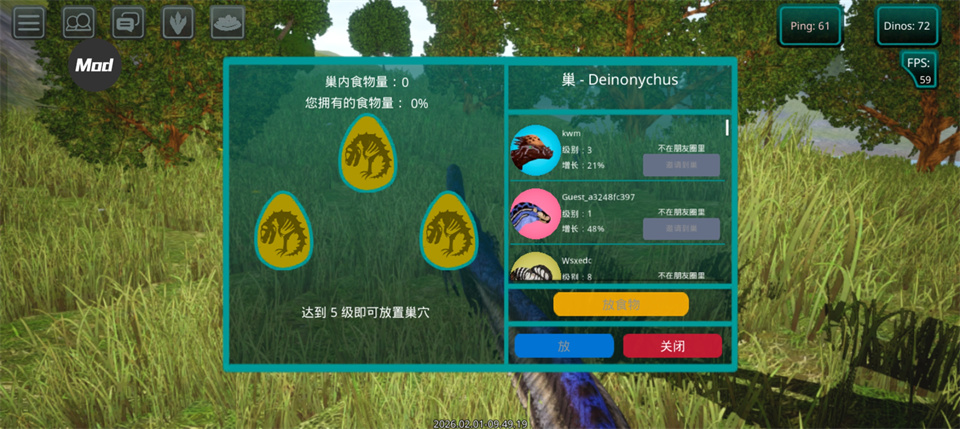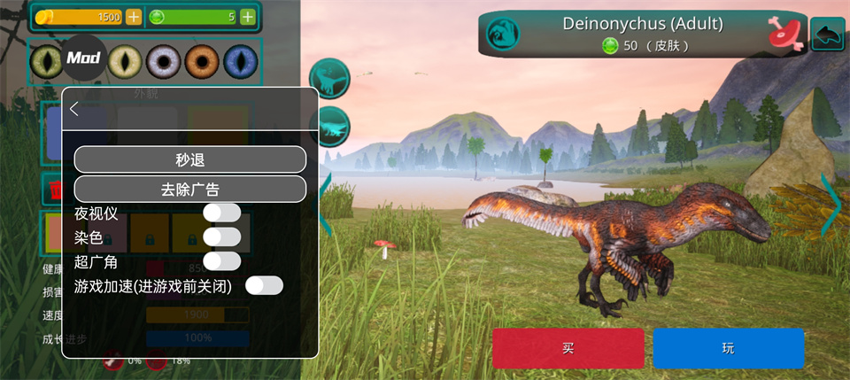诅咒之岛无线金币钻石版是一款趣味十足的在线恐龙模拟器,以侏罗纪世界为背景,采用了顶尖的3D渲染技术打造,可以让玩家深切的感受到游戏其高清精致的画面、真实逼真的恐龙设定,还拥有引人入胜的全新故事剧情,栩栩如生、形象逼真到令人战栗不已的全新恐龙,再加上好玩刺激的游戏玩法,给玩家一种身临其境的真实感。 在诅咒之岛游戏中玩家将来到神秘而又恐怖的侏罗纪世界,可以让你体验侏罗纪恐龙世界和恐龙生活,你必须选择你的恐龙,如霸王龙、迅猛龙等等,并不断培养你的恐龙,不断的升级恐龙的战斗力,以此来称霸侏罗纪时代。 另外,诅咒之岛游戏中呈现了所有流行的恐龙,如霸王龙、棘龙等食肉动物开始,到三角龙、甲龙等食草动物,更是超过了23种恐龙,包括飞行和游泳物种,以及所有恐龙,它们都等待着你来驯服! 诅咒之岛内置菜单功能说明 1、免广告获得奖励 2、秒转向 3、超广角 4、夜视仪 5、上色 6、大厅时间加速(一定不能在游戏内开启,必封号!) 7、立即返回主界面 游戏特色 1、成长系统! 恐龙不会立即显得很大,需要照顾。 你需要培养他。 为此,你需要生存、寻找食物和饮料,并避免来自其他肉食恐龙(例如巨龙、重爪龙或暴龙)的潜在威胁。 2、首先,玩家需要选择一种恐龙。 请记住 - 这是您个人的恐龙! 在恐龙游戏中,不仅有肉食性恐龙和草食性恐龙,还有会飞的恐龙,例如翼手龙,玩家可以与自己物种的食肉动物联合成群,以抵抗其他物种,最重要的是,生存! 3、食物提取,如果恐龙是掠食者,那么你需要杀死其他玩家的恐龙才能得到自己的肉,如果你是草食动物,那么食物就更容易了,你需要特殊的蕨类植物,你可以得到足够的他们! 地图上任意湖泊、水库都可以饮用。 4、文字聊天和好友系统。 您可以与世界各地的朋友和玩家聊天、制定策略、缔造和平等等。 并且还可以将玩家添加为好友,并加入到游戏的骨架中。 诅咒之岛内置菜单商店任务怎么做 1、呼出设置菜单栏,在右侧选择黄色的按钮【任务】打开。 2、由此就打开了商店任务列表,商店里的任务每天都不一样,会在8:00每日刷新。比如今天的任务就是在迅猛龙中存货30分钟以及在任何恐龙中存货30分钟。 3、然后我们返回刚才的菜单栏,可以按下蓝色按钮【朋友们】,邀请好友来一同完成每天的任务。 4、打开【服务器列表】,就可以和朋友们一起进入服务器完成任务啦。这个任务很简单,找到随意一只恐龙溜着他跑30分钟即可。 诅咒之岛内置菜单筑巢与孵化攻略 前置条件:角色等级达到5级,并完成100%成长进度 1、进入诅咒之岛内置菜单版,后点击“孵化”相关图标,开启筑巢流程。 2、孵蛋不需要特殊材料,但在产蛋前必须保证进食充足,可通过“嗅探”功能寻找食物来源。 3、选择合适地点搭建巢穴,如靠近水源、防空洞附近或常见刷肉区域,能提升安全性。 4、当蛋的进度条充满后即可邀请其他玩家协助孵化,最多可孵出三枚蛋(不同恐龙孵化时长略有差异,通常在9—10分钟左右)。 5、新出生的小恐龙饥饿值与水量较低,需要及时进行喂养。 6、已被孵化的恐龙无法再次用于孵蛋。 诅咒之岛内置菜单游玩常见问题及解决方法 1、点击广告无反应且未解锁:由于网络延迟+需等广告填充,需等待按钮变亮后点击;多次点击后,因为延迟恐龙可能不会立即解锁,需等3-5分钟 2、在游戏主界面左下角可切换为其他语言,但切换不回中文。 3、游戏卡加载:可在本站搜索UU加速器辅助运行 4、进入游戏弹出提示框:在加速器加速的情况下,多次尝试点击“再次” 5、再次进入服务器养成进度会消失,如需保留账号可绑定邮箱 6、如果无法更新,请卸载重新安装,再此之前请先保存好存档 7、防诈骗提示:游戏内有聊天系统,请保持警惕,不轻信陌生人的话,不点击不明链接,不进行交易,防止造成损失 8、使用立即返回主界面功能后,免广告获取恐龙跟商店免广告领奖励功能可能会发生冲突只能使用一次,重新进入游戏即可 游戏亮点 1、成长系统 恐龙不会立即显得很大,需要照顾。 你需要培养他。 为此,你需要生存、寻找食物和饮料,并避免来自其他肉食恐龙(例如巨龙、重爪龙或暴龙)的潜在威胁。 2、首先,玩家需要选择一种恐龙 请记住 - 这是您个人的恐龙!在恐龙游戏中,不仅有肉食性恐龙和草食性恐龙,还有会飞的恐龙,例如翼手龙,玩家可以与自己物种的食肉动物联合成群,以抵抗其他物种,最重要的是,生存! 3、食物提取 如果恐龙是掠食者,那么你需要杀死其他玩家的恐龙才能得到自己的肉,如果你是草食动物,那么食物就更容易了,你需要特殊的蕨类植物,你可以得到足够的他们! 地图上任意湖泊、水库都可以饮用。 4、文字聊天和好友系统 您可以与世界各地的朋友和玩家聊天、制定策略、缔造和平等等。 并且还可以将玩家添加为好友,并加入到游戏的骨架中。 游戏玩法 1、发现更多:基本上我们所了解的恐龙种类,听闻过的恐龙类目,在这里都能够找到,极为齐全。 2、联机生存:能够和小伙伴一同生存,变身为不同种类的恐龙,一起在这个恐龙世界中存活下来。 3、穿越地形:不仅仅是森林、草原还有水中,甚至还会有天空飞行的种类,想要的应有尽有。 4、极限生存:除了需要完成基本的任务之外,您需要喝水、捕食等,日常就是在这个世界中努力生存。 5、提升属性:每个恐龙都拥有专属的属性,会带来